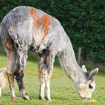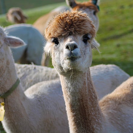 Alpacas are similar to, and often confused with, the llama. They are actually closely related, both being part of the camelid family, however, alpacas are noticeably smaller than llamas.